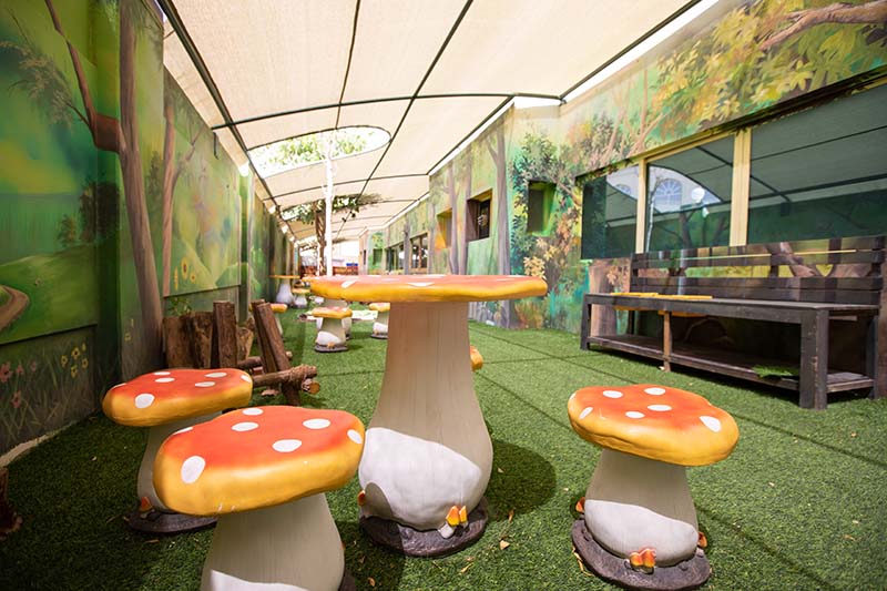 يمكن لطلاب رياض الأطفال والابتدائي الاستمتاع بالقراءة والاستكشاف واللعب في منطقة خارجية تحبس الأنفاس حيث يتم تحفيز الخيال بشكل أكثر متعة. تعد غابة القراءة ملاذًا للأطفال حيث يمكنهم ممارسة الأنشطة اللامنهجية المختلفة والعمل في بيئة ملونة رائعة خارج حدود الفصول الدراسية.